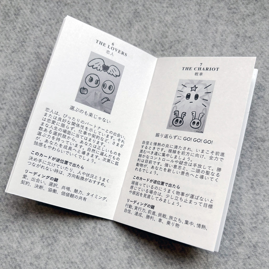 絵柄はシンプルな線と明るい色合いで描かれ、赤ん坊のような顔立ちと、くりっとした好奇心あふれる瞳が特徴です。それぞれのカードがもつ希望の要素を大切にしながら、22枚の大アルカナの絵柄を、1年かけて丁寧に描き下ろしました。