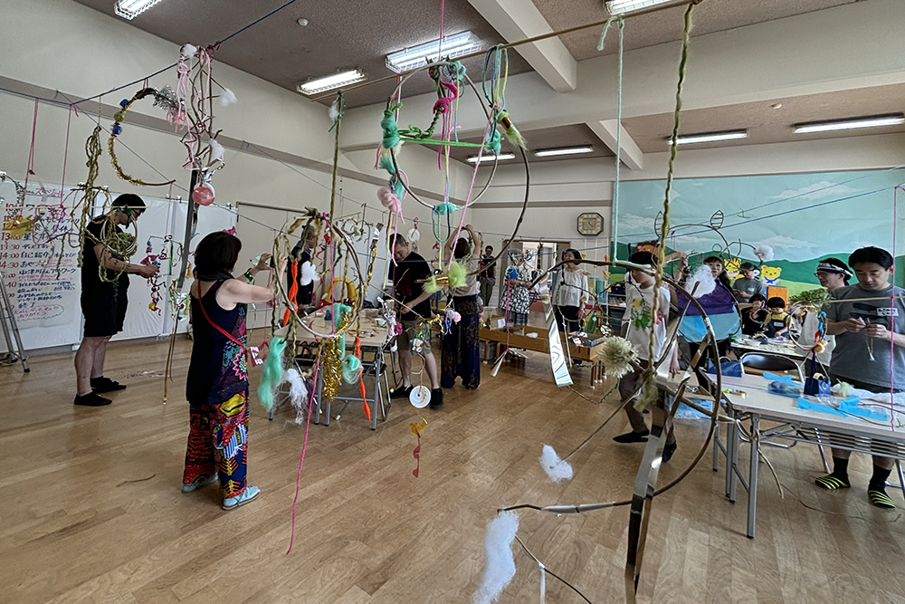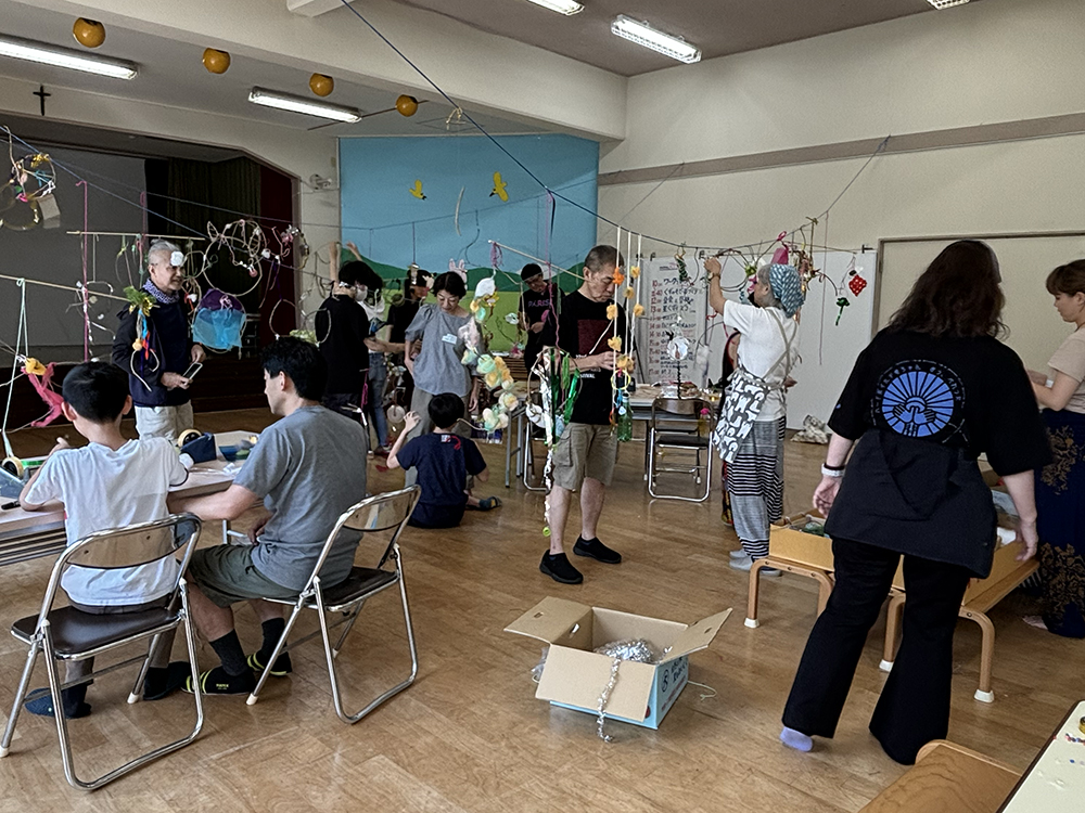 After the lunch break, the hall transformed into the “Hoshi-Kuzu Disco,” where everyone danced along to beats spun by a DJ. To wrap up the day, we had a relaxing “cool-down” session: everyone lay down on the floor to gaze up at the hanging Kuzu mobiles. Under the indoor lights, the reflective materials shimmered beautifully, revealing a different side of the artworks and allowing us to enjoy the various expressions of our creations from every angle.