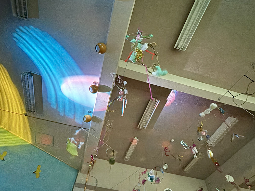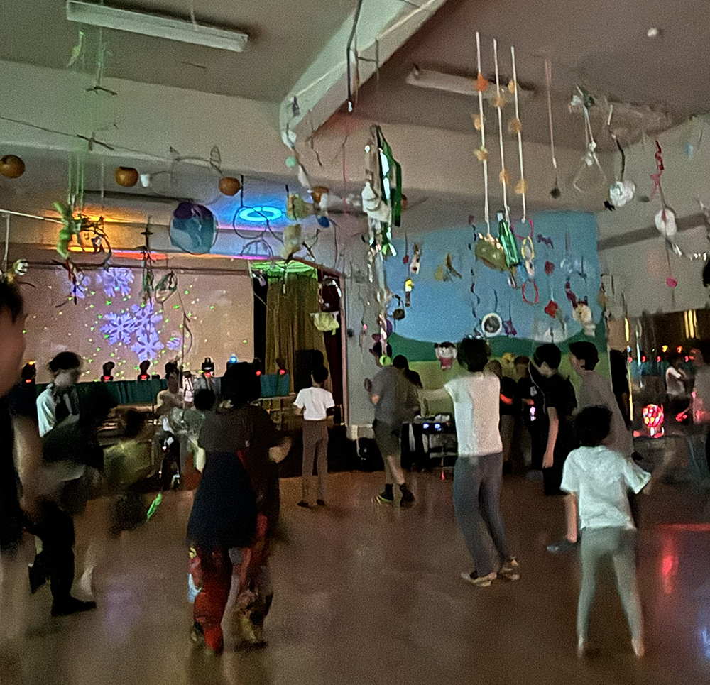 お昼休憩をはさんだあと、DJ の音楽に合わせてほしくずディスコと題して皆で踊り、最後は床に寝そべって葛モビールを見上げてクールダウン。キラキラと反射する素材が照明に照らされ、制作時とは違う作品の表情を様々な角度から楽しみました。