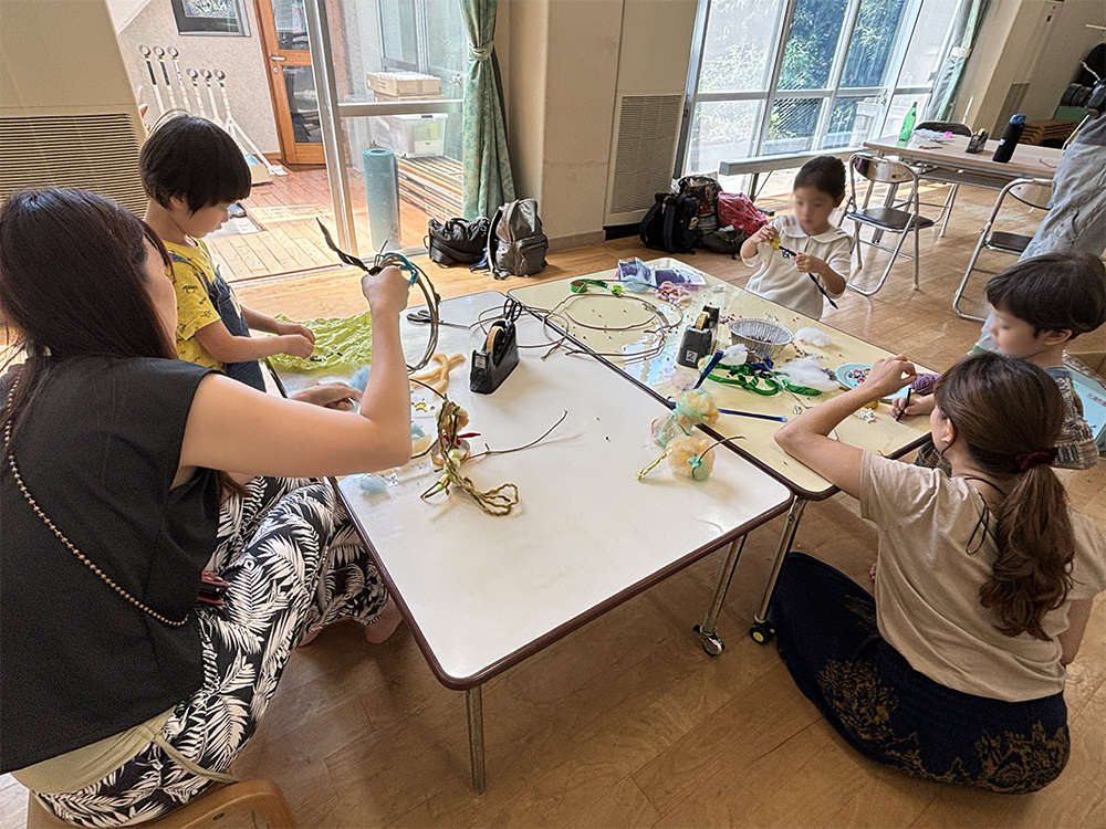To kick off the workshop, we wanted to introduce the Kuzu plant in a way that would be fun for even the youngest children. We presented a short animation followed by a playful dialogue performance. Afterwards, the participants dove into the “Hoshi-Kuzu” (Stardust) theme, creating unique mobiles by combining shimmering materials with natural Kuzu vines.
